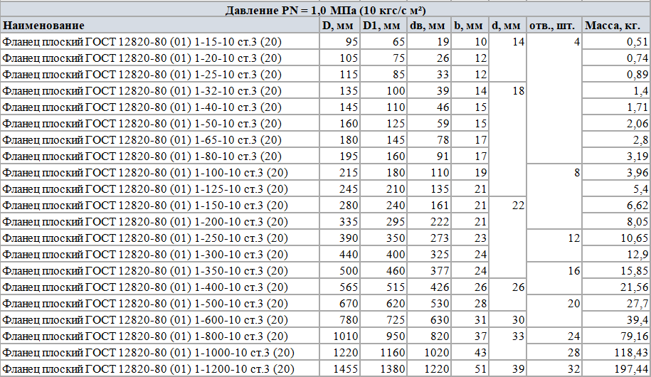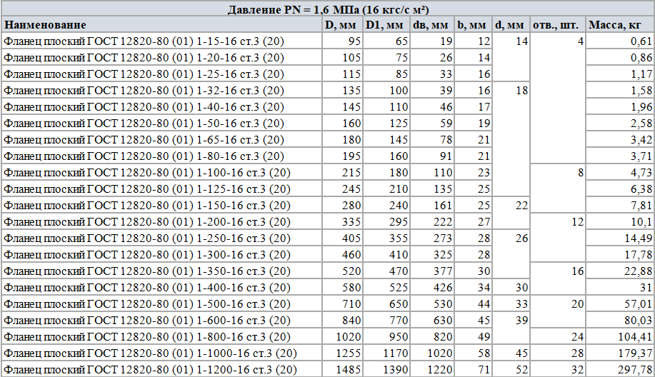 Плоские стальные фланцы, изготовленные с соблюдением всех требований ГОСТ 12820, обладают следующими параметрами: